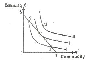 In the diagram above, ST is the budget line while l,ll and lll represent indifference curves. A rational consumer will choose to consume at point