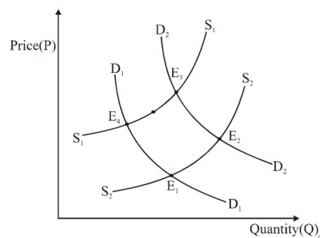 The diagram above shows the shifts in both demand supply curves. What is the new equilibrium point after the shifts?