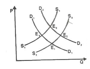 The diagram above shows theshifts in both demand supply curves. What is the new equilibrium point after the shifts?