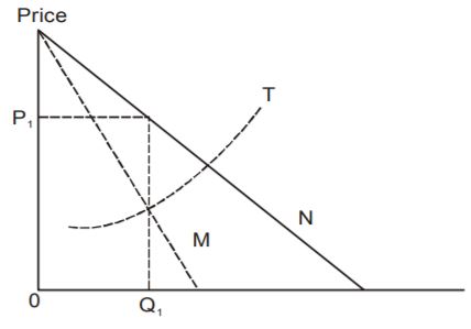 In the figure above, the broken line labelled M is the marginal revenue curve of a