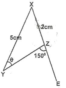 In the figure, XYZ is a triangle with XY = 5cm, XZ = 2cm and XZ is produced to E making the angle < YZE = 150. If the angle XYZ = , calculate the value of sin