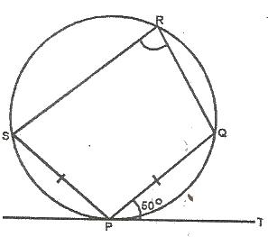 PQRS is a cyclic quadrilateral which PQ = PS. PT is a tangent to the circle and PQ makes an angle of 50 with the tangent as shown in the figure. What is the size of QRS?