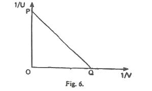 In a light experiment with a convex lens a student plotted a graph as shown above of the reciprocal of object distance (1)/u against the reciprocal of image distance (1)/v . the focal length of the lens is given as