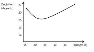 The figure above shows a plot of angles of deviation through a glass prism when light is incident at θ degrees on the prism. The incident angle that produces the minimum deviation is