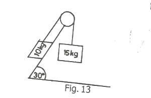 A body of mass 10kg on a smooth inclined plane is connected to a smooth pulley to a mass of 15kg as shown above, the acceleration of the system is