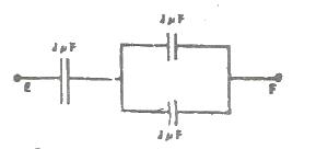 Three 2-µF capacitors are arranged as seen in the circuit above . The effective capacitance between E and F is