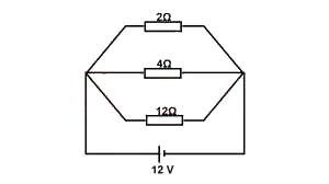In the circuit above, three resistors, 2Ω, 4Ω and 12Ω are connected in parallel and a 12V battery is connected across the combination. The current flowing through the 12Ω resistors is